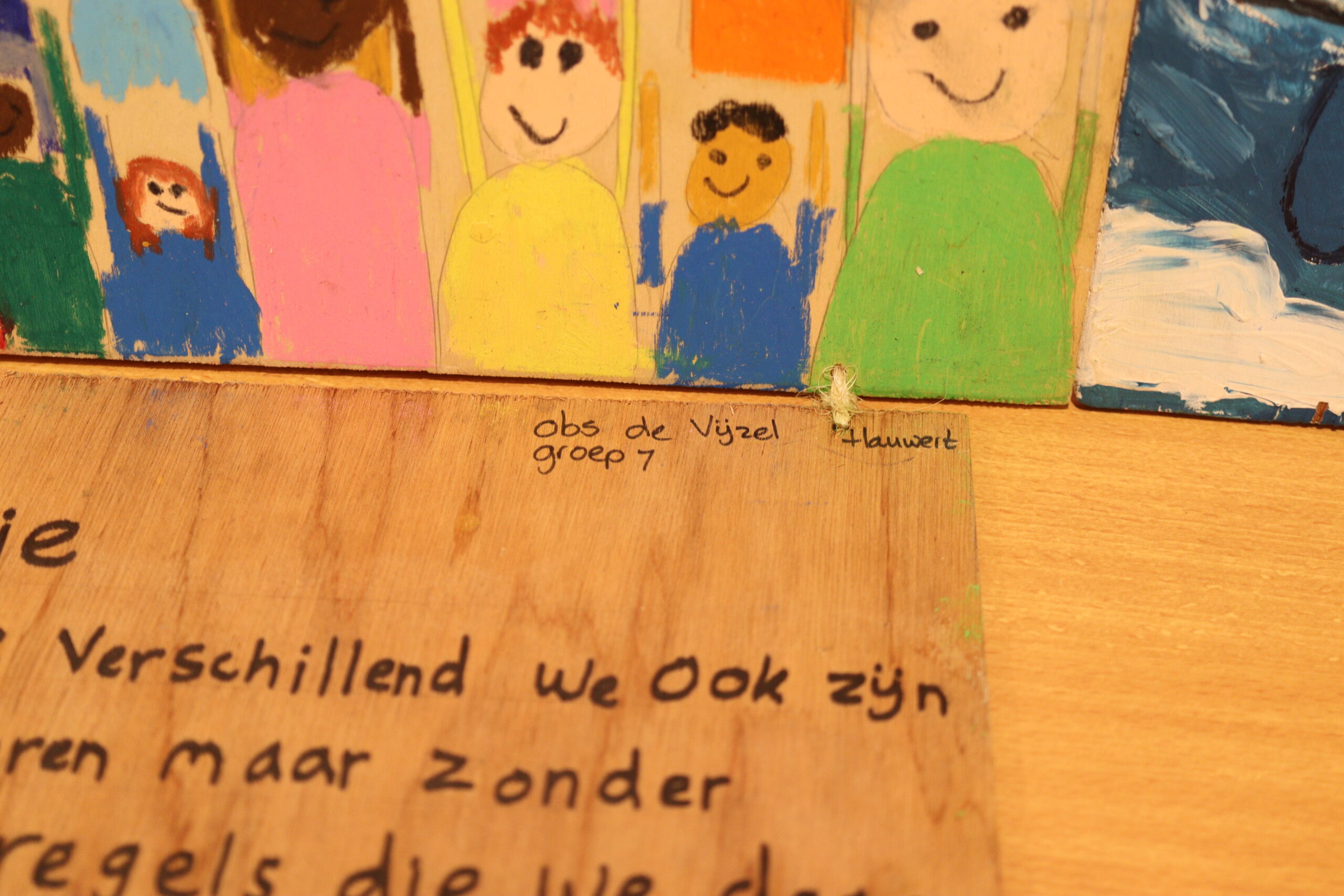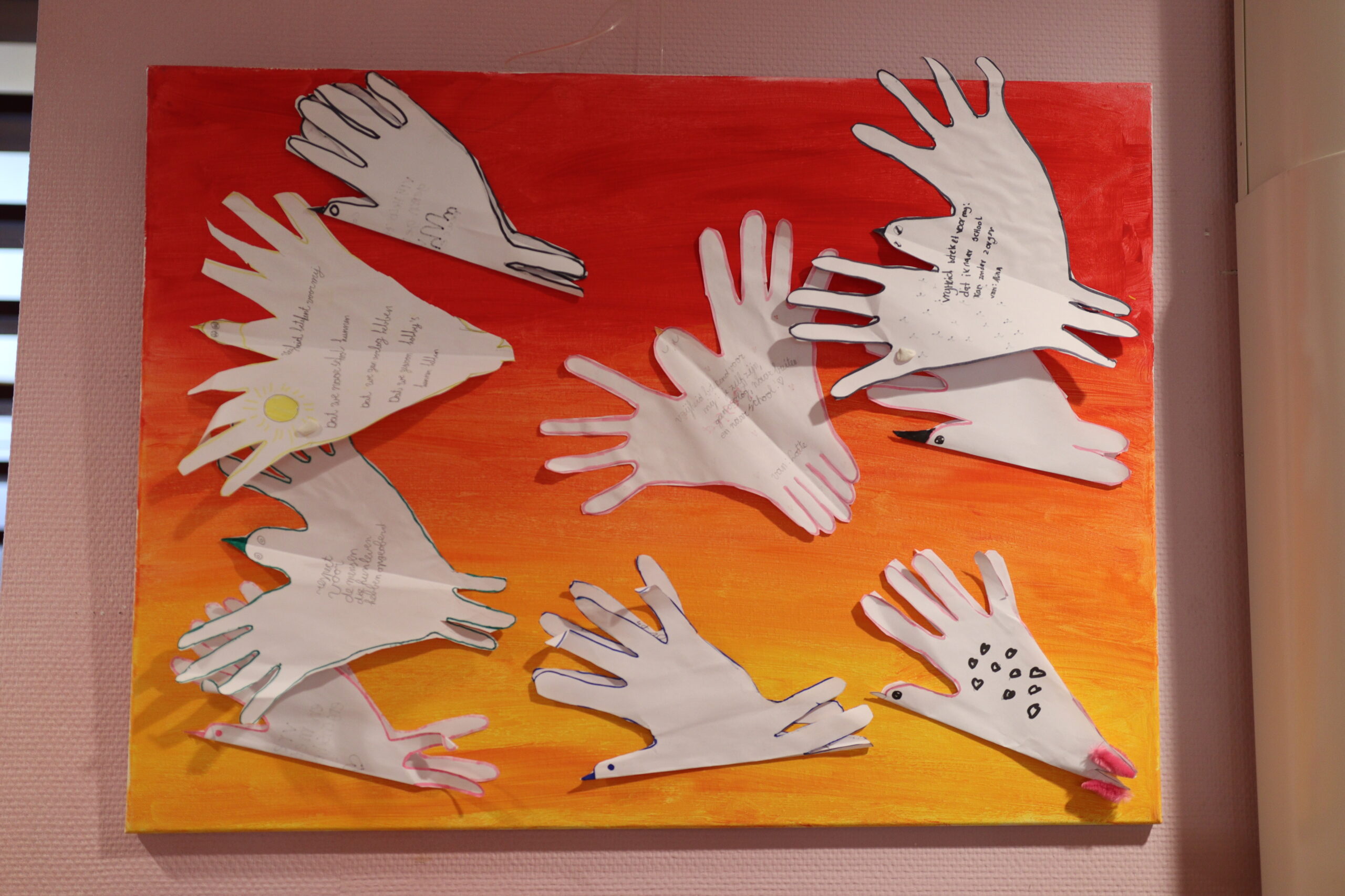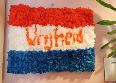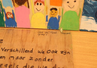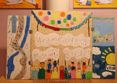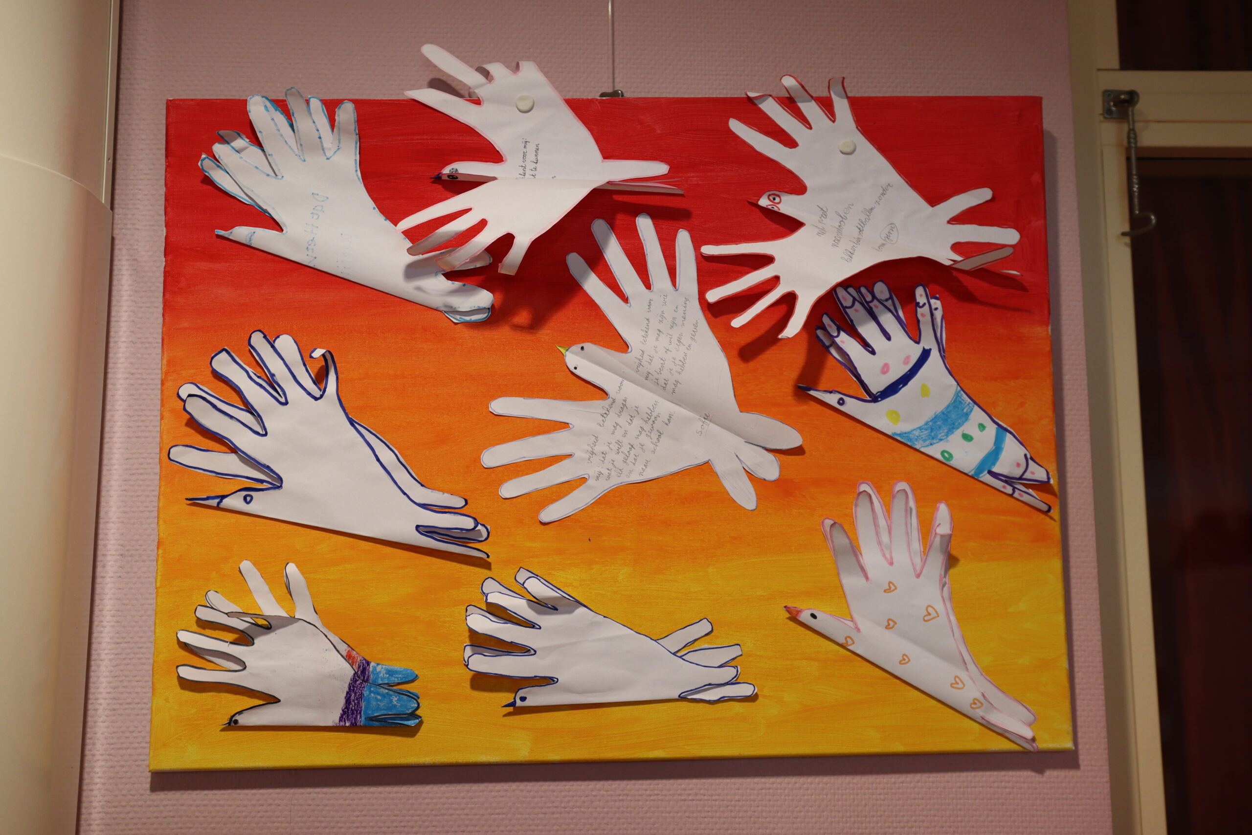 Voor dit kunstwerk hebben de kinderen van groep 7 een vrijheidsduif gemaakt van de omtrek van hun hand. Hierin staat geschreven waar vrijheid voor hun voor staat.