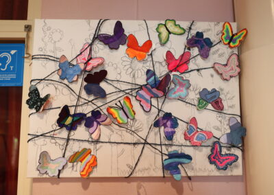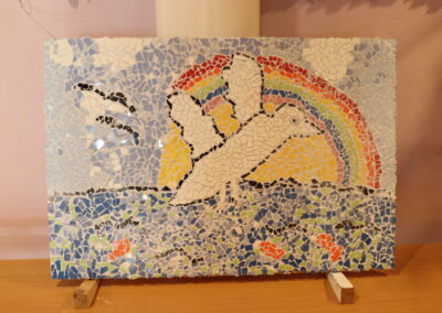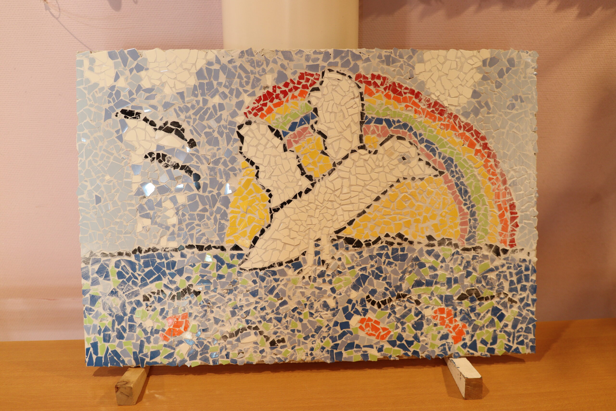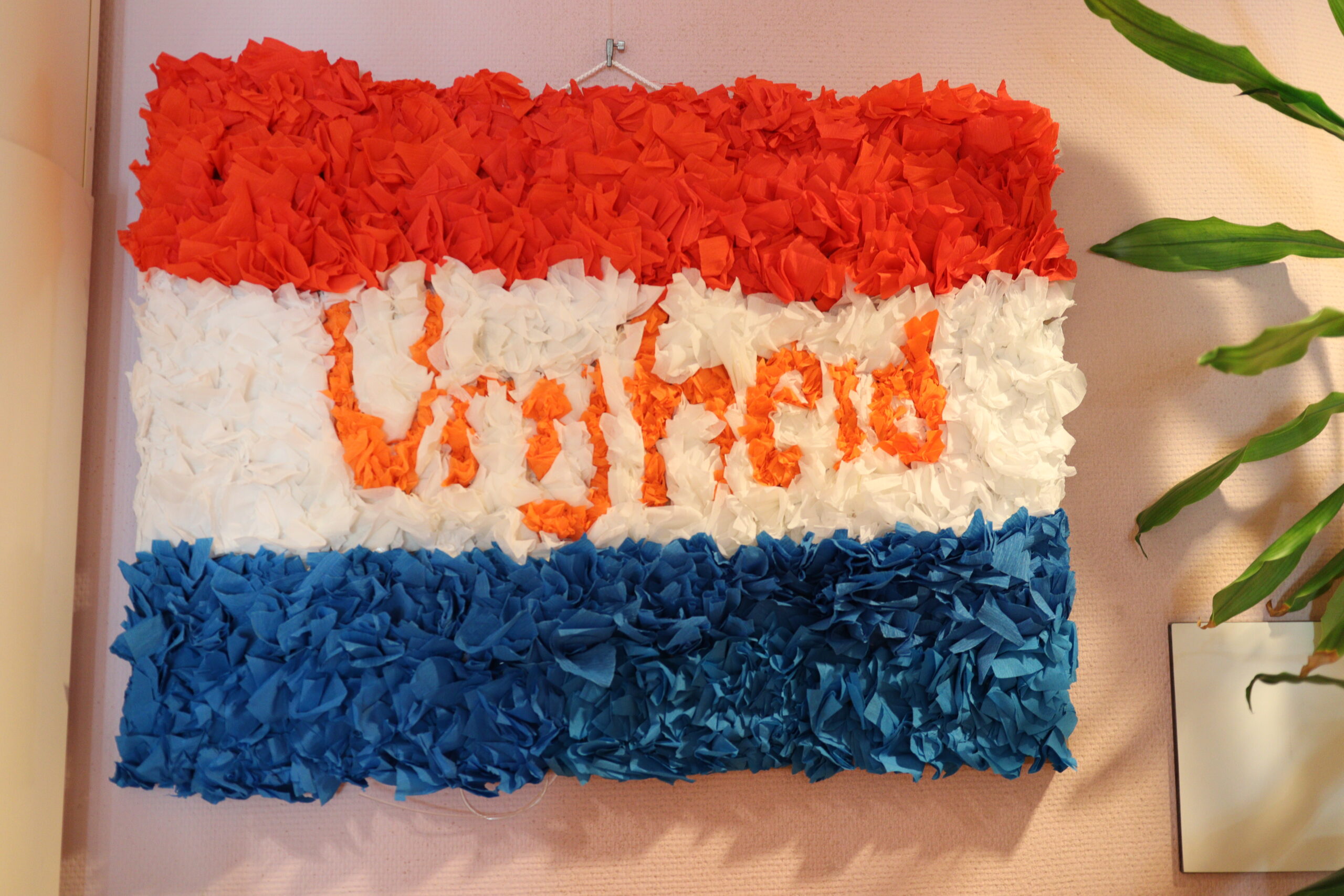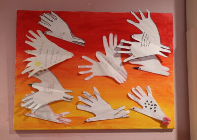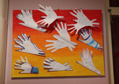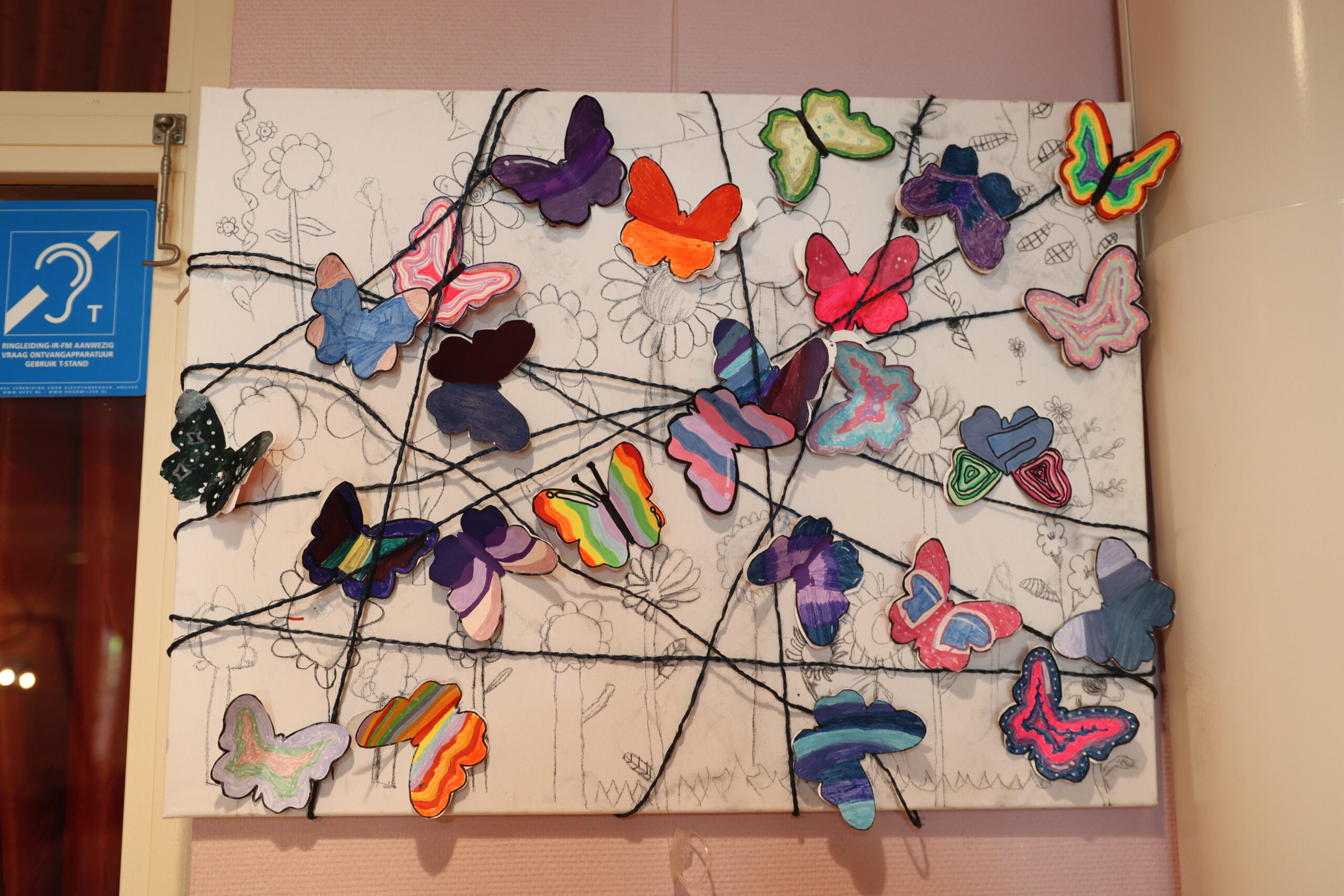Voor dit kunstwerk hebben de kinderen van groep 7 een vrijheidsduif gemaakt van de omtrek van hun hand. Hierin staat geschreven waar vrijheid voor hun voor staat.