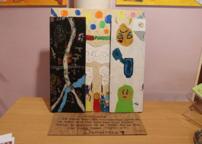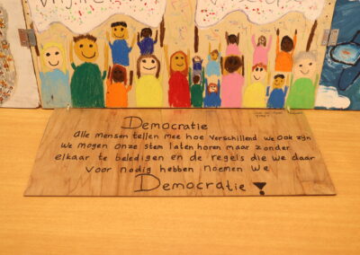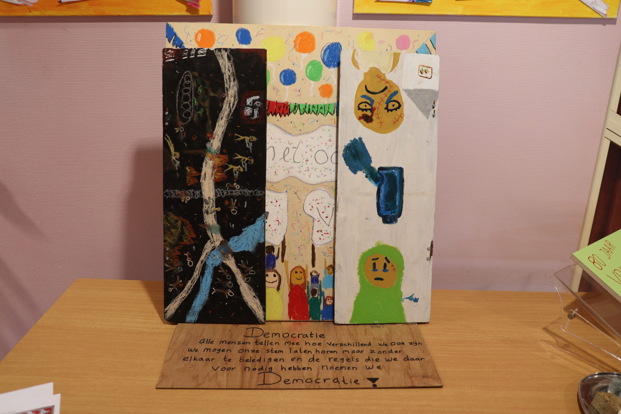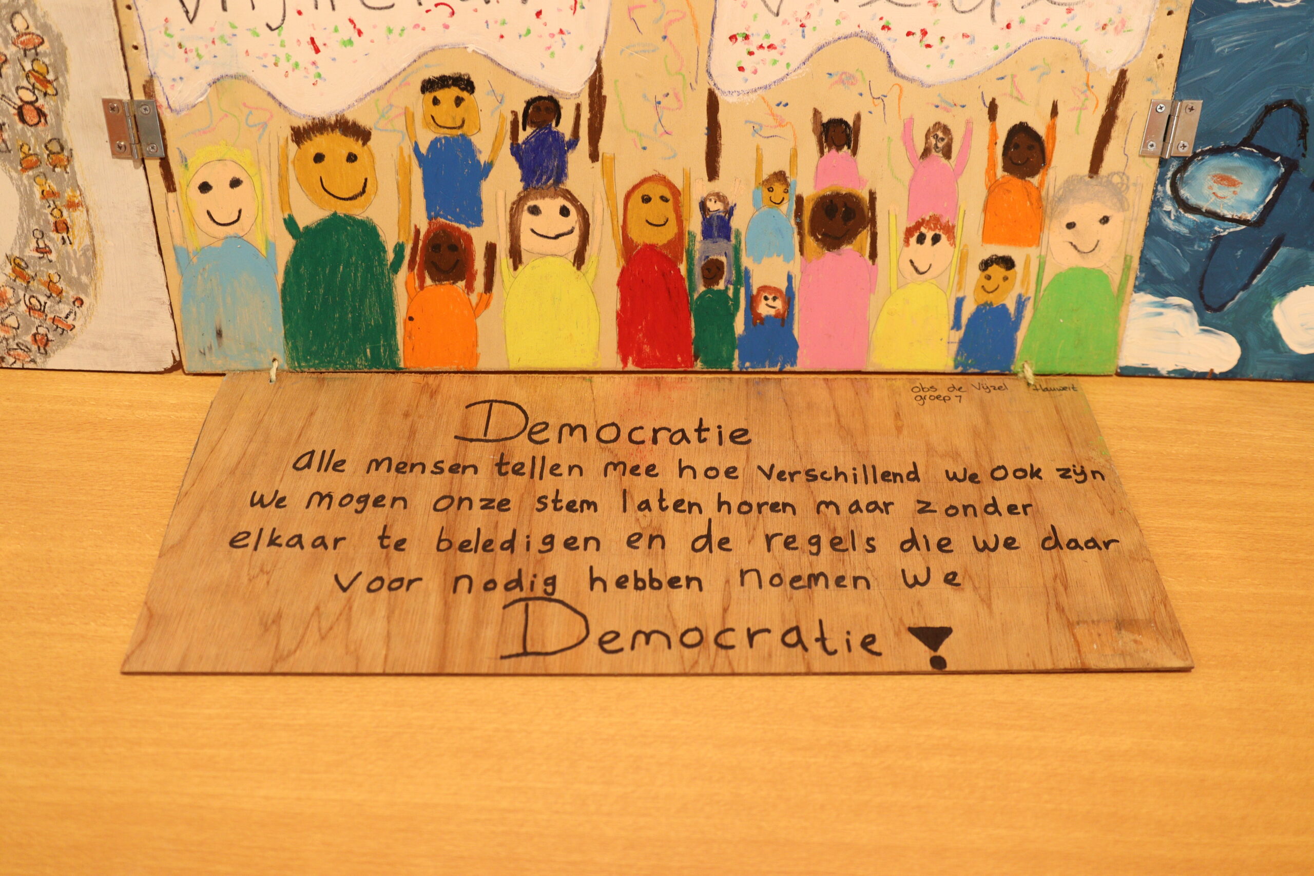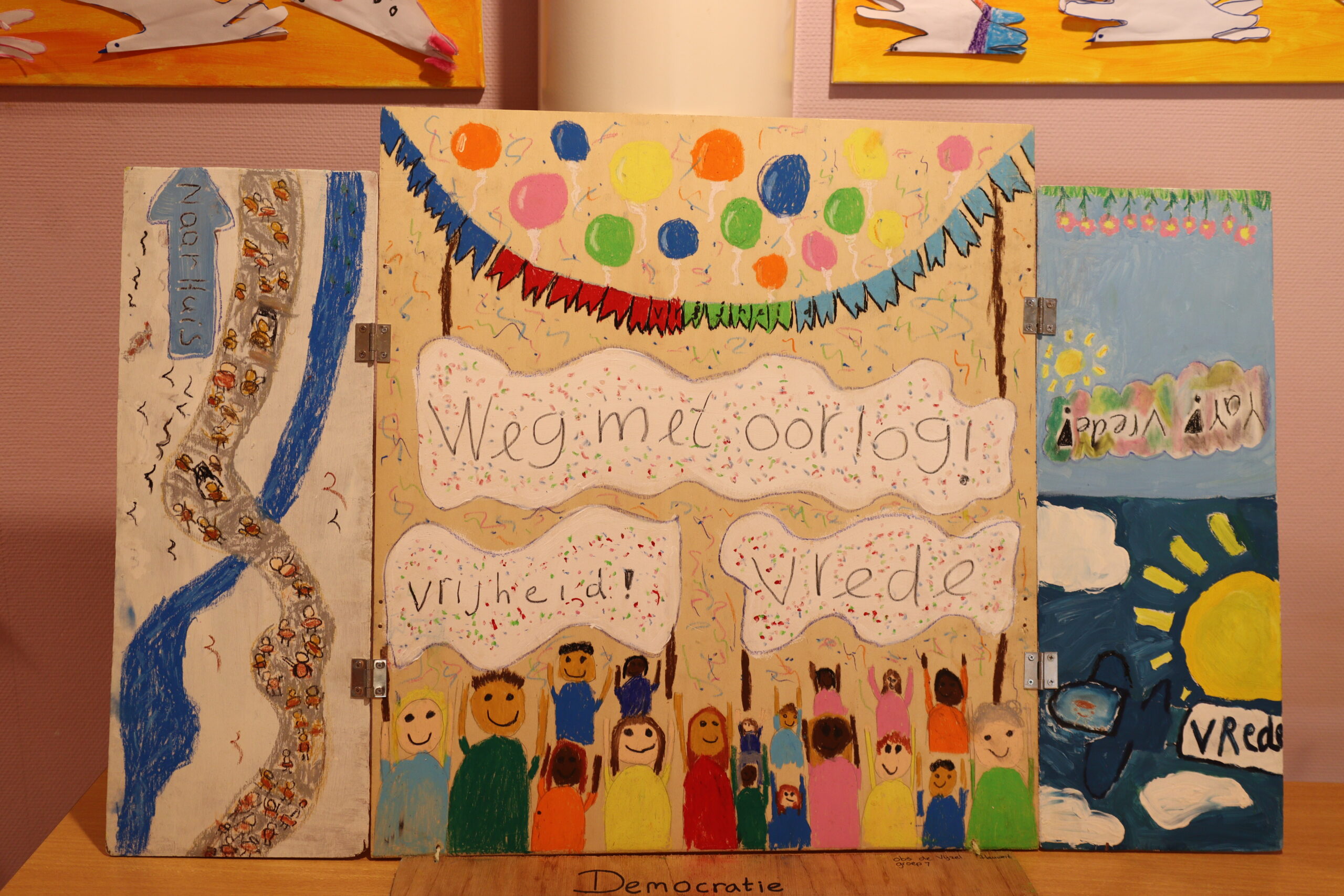 Als het drieluik gesloten is, zien we de oorlog (mensen die vluchten, verdriet en pijn). Als het drieluik open is zien we vrede, feest en mensen die weer naar huis kunnen. Op het bordje staat beschreven hoe groep 7 over democratie denkt.